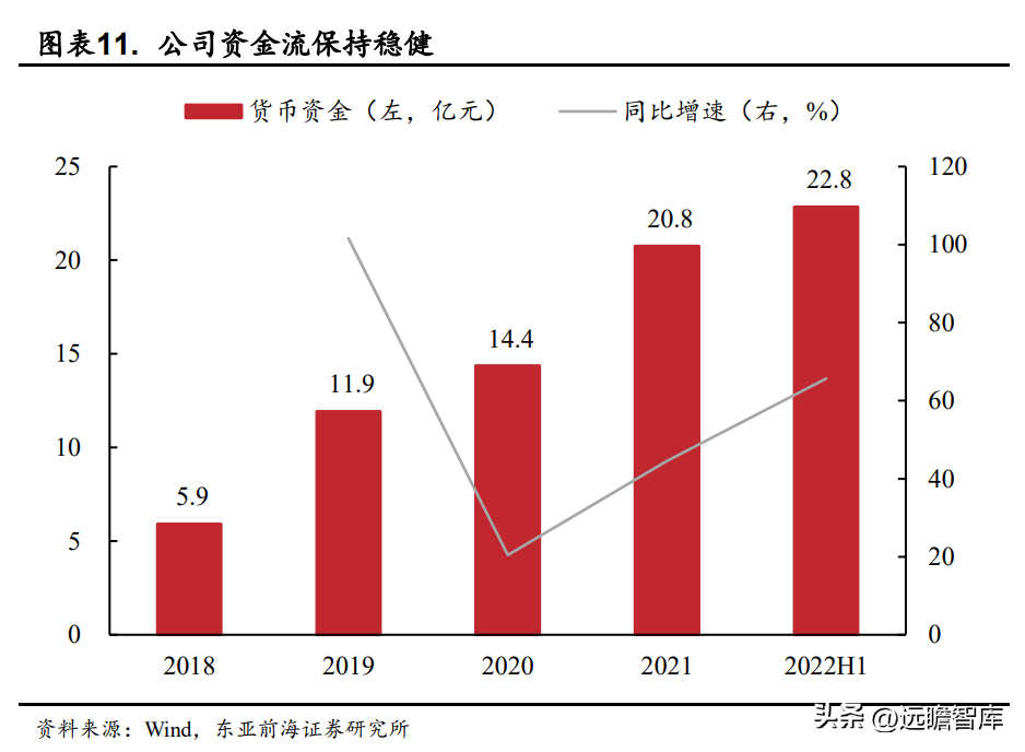 资金流方面,在公司新增项目较多的情况下未呈现显著承压的状况,处于相对稳健状态。2021年末公司货币资金总额为20.8亿元,同比增长44.5%;2022 年上半年公司货币资金为 22.8 亿元,同比增长 65.7%。
