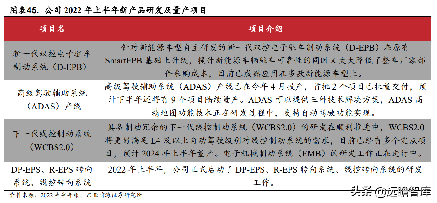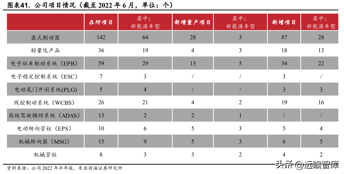 公司 EPB 研发能力行业领先,为业绩提供支撑。2022 上半年电子驻车制动系统(EPB)在研项目 59 项,新增量产项目 13 项,新增项目 34 项。