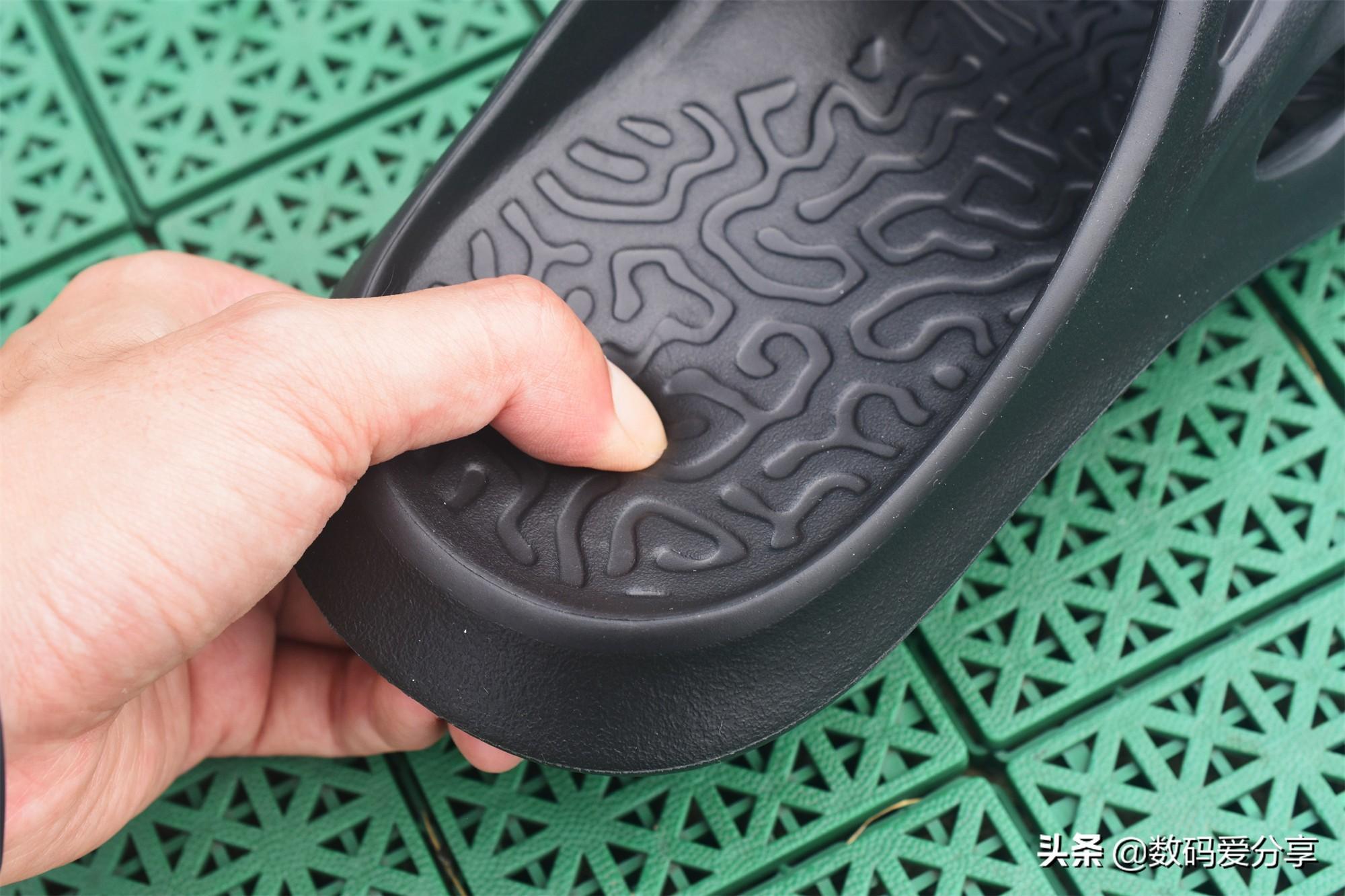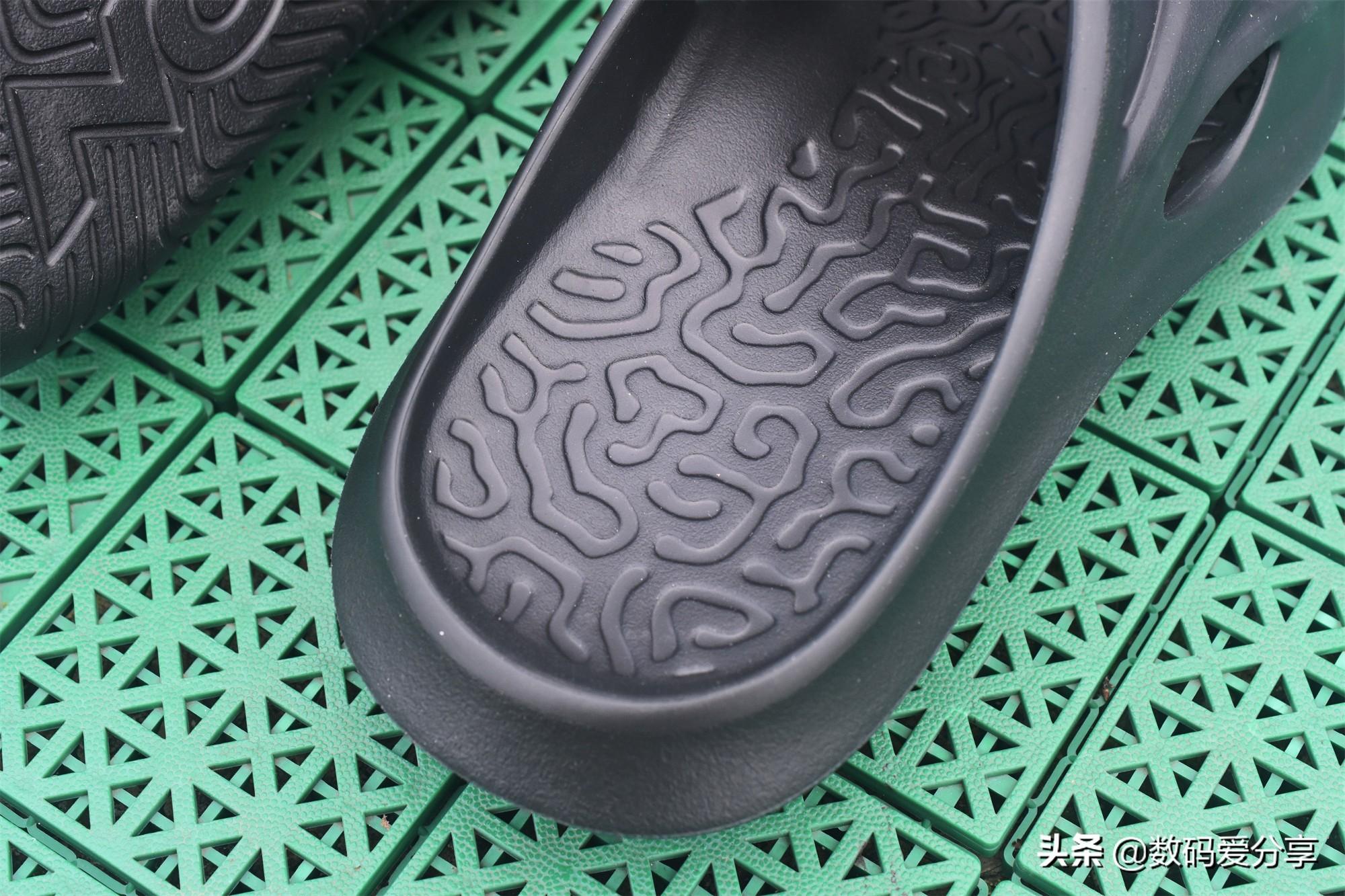 其实,近几年不少运动品牌都推出了拖鞋,比较热门的就是匹克的态极拖鞋了,而作为互联网运动社交领军品牌“咕咚”在陆续推出多款智能跑鞋后,也顺势在今年推出了这款“咕咚运动舒缓拖鞋”。和传统家居拖鞋相比,咕咚运动舒缓拖鞋给人的第一印象就是外形稍微有些“夸张”,比如说镂空的鞋面设计、纹路较多的鞋床等。
