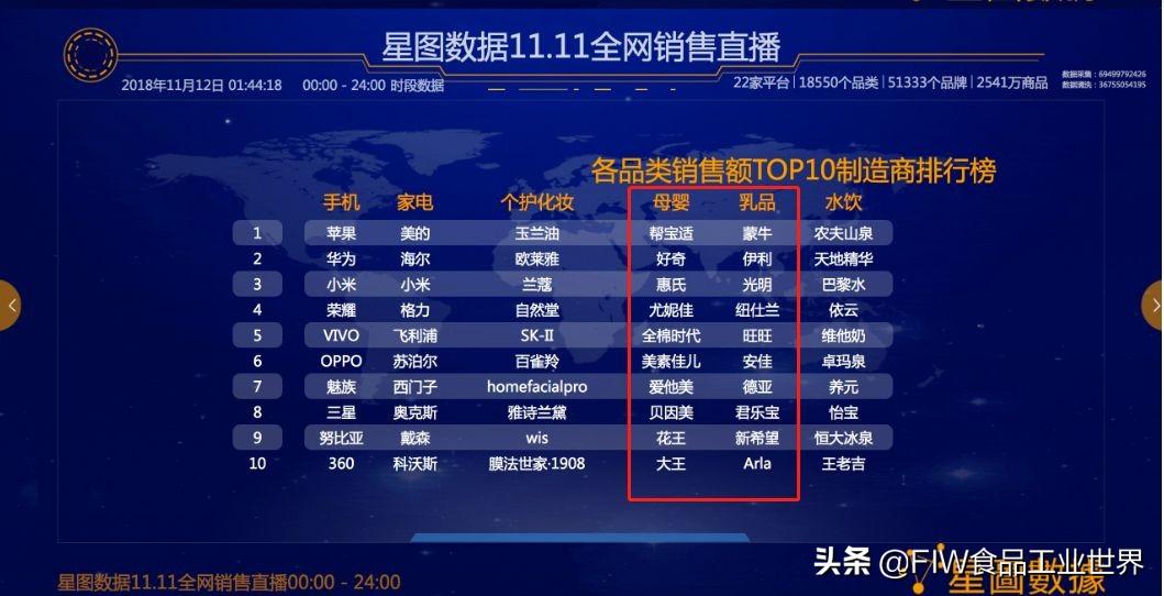 据星图数据的2018双十一销售数据报告显示,上榜母婴品类销售额前十的奶粉品牌包括有:惠氏(3)、美素佳儿(6)、爱他美(7)和贝因美(8)。蒙牛和伊利则被分到了乳品类别。