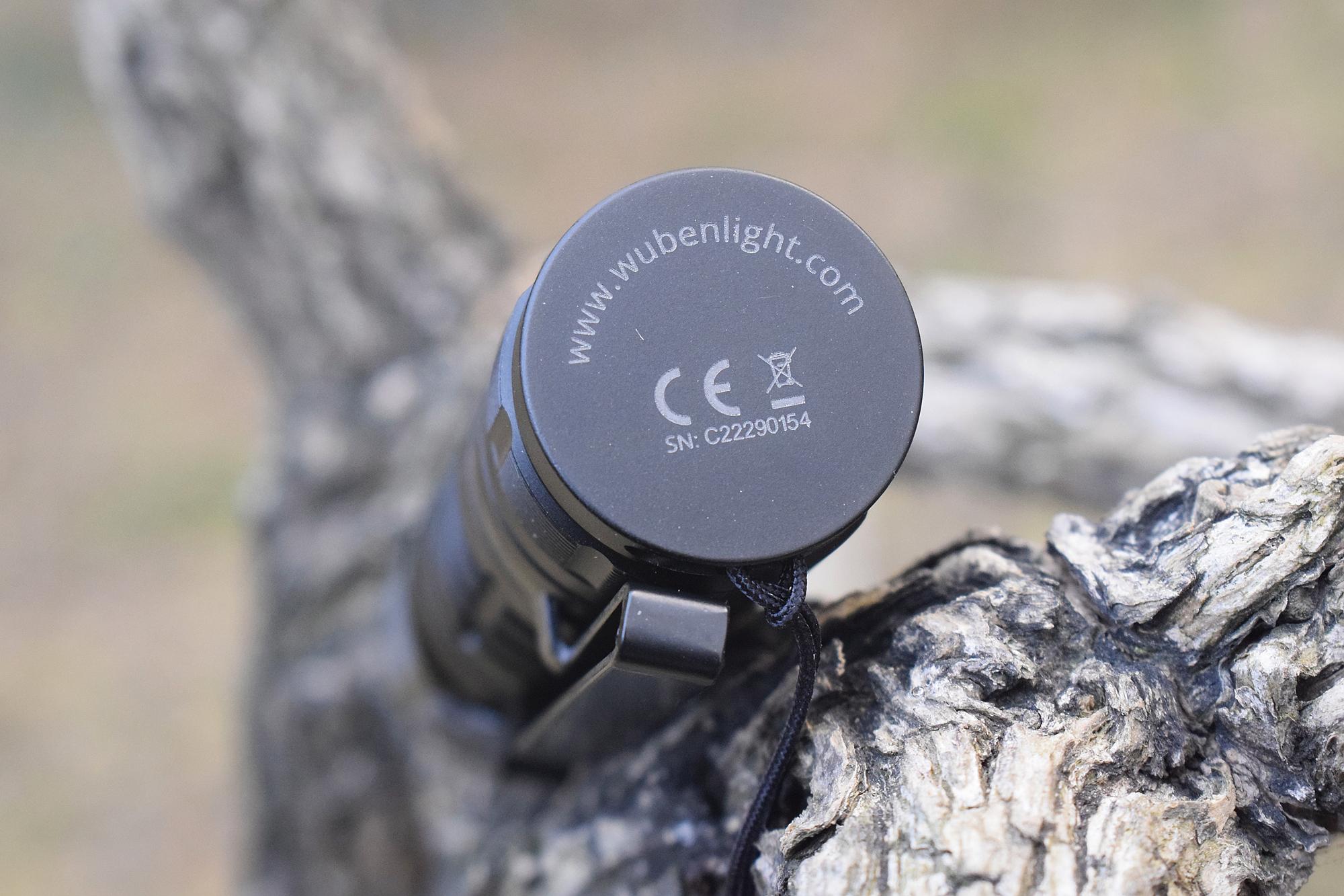 筒头上的按键很有意思,胶质,微凹,外圈一抹银环,正中印有“W(WUBEN)”字样的LOGO,整洁大方。按动时清脆有弹力,盲操时很容易摸到位置,戴着手套也能轻松操作。