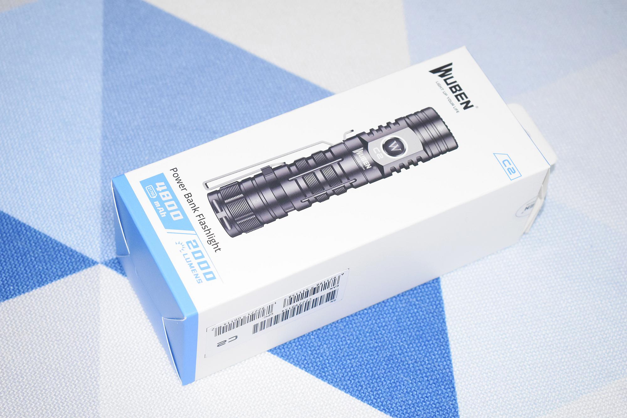 产品包装为务本经典的白面蓝底,很有辨识度。透过盒绘可以了解到其大体外观,底部下角处标有4800mAh(锂电池)和2000LM(高强度)的字样。