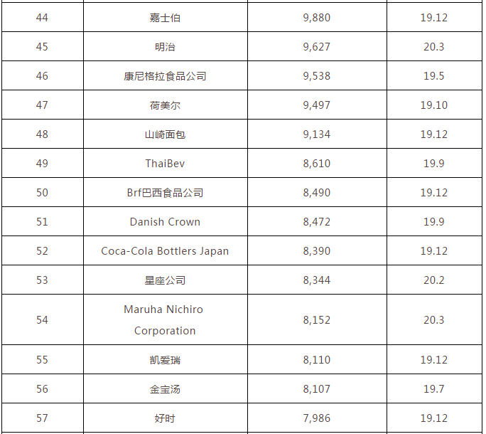 再看中国品牌,今年上榜的有伊利、蒙牛、娃哈哈、青岛啤酒,与去年一致。而位于榜单第14位的史密斯菲尔德是万洲国际的美国子公司。