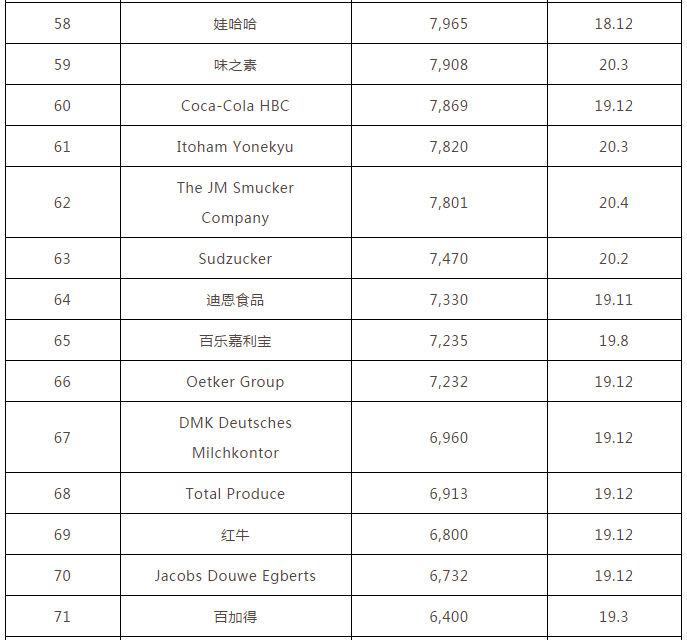 娃哈哈的榜单排名更是从去年的65位,直接跃升到了58位,进步7名。(2020榜单采用的是2018年业绩,2019年采用2017年业绩)