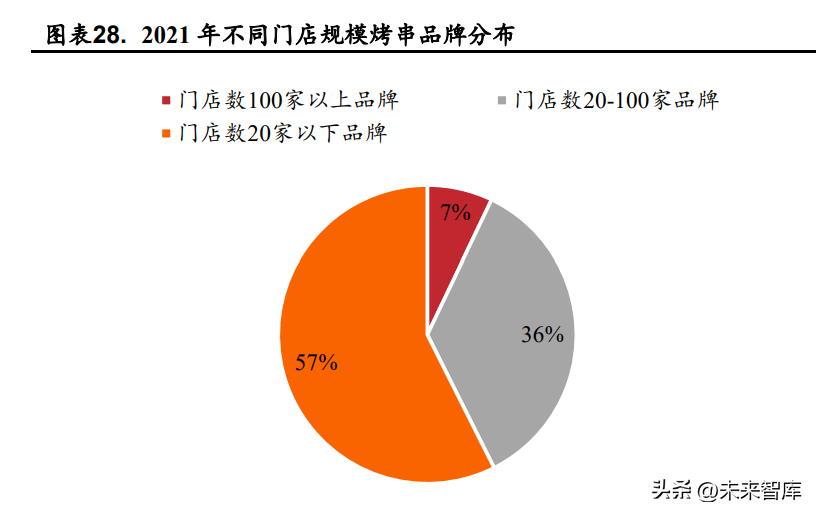 烧烤市场高度分散,尚无头部品牌。从市场格局来看,烧烤市场集 中度和连锁化率均较低,2021 年烧烤市场连锁化率为 14.2%,低于火锅 (20.7%)和八大菜系(15.2%)的连锁化率。2021 年门店数达到 100 家以 上的烧烤品牌仅占整个市场的 7.1%。烤串供应链环节由于仍然存在人工穿 串导致连锁化程度低,头部品牌中门店数超过 100 家的较少。