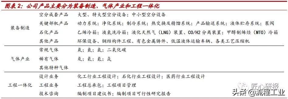 空分设备技术不断突破,大力进军工业气体行业。目前,公司在 10 万等级及以上空分设备的设计制造方面取得巨大突破,年产空分设备制氧量总和达到 150 万 m3/h,公司设计制造的产品遍布世界 40 多个和地区。公司利用在空分设备设计制造的优势,实现产业链的延伸,大力进军工业气体领域,在全国范围内投资设立多家专业气体公司,目前公司已发展成为国内主要的工业气体供应商之一。