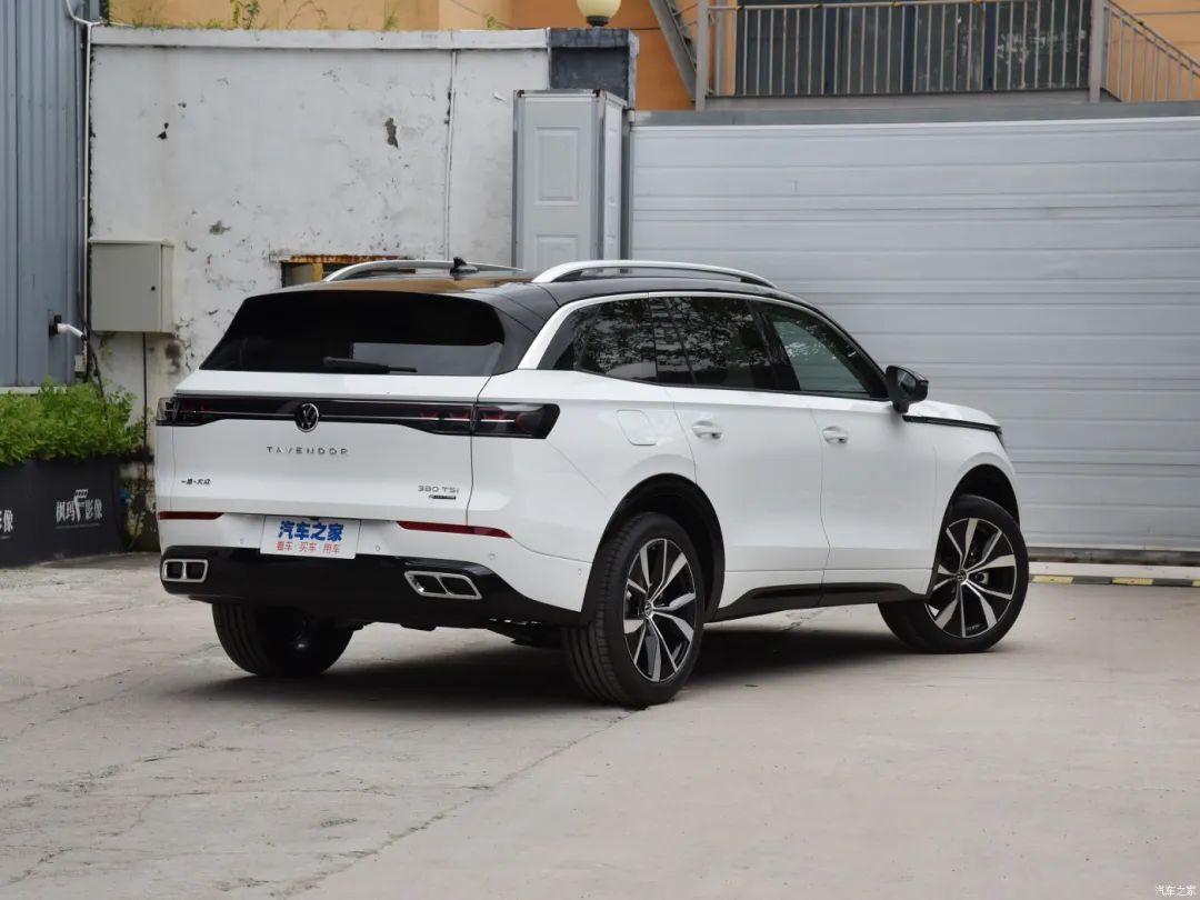车尾风格简约,贯穿式尾灯造型狭长,内部的X形元素在探岳、速腾等车型也可见到。后包围的双边共四出排气仅是装饰。此外,揽巡前脸和车尾的品牌LOGO均可点亮。