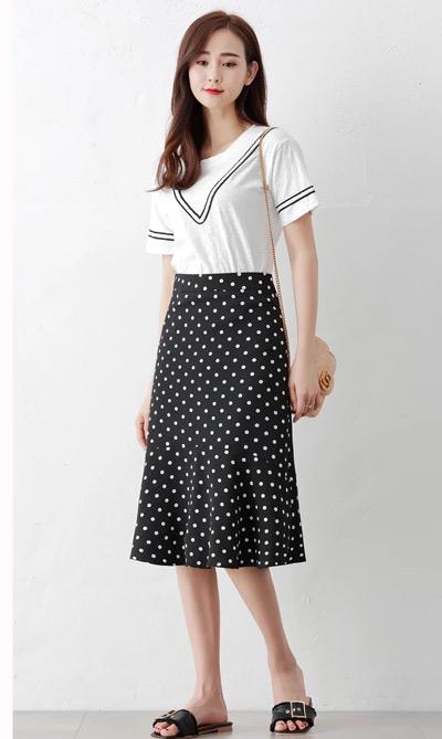波点鱼尾半身裙,月销量26454笔。俏丽的波点轻松减龄活泼春夏,打破常规的廓形瞬间让人轻松有活力,灵动的荷叶边裙摆跟着步伐随意摇曳,中长款的版型加上高腰设计显瘦显高,小个子美美也不用担心。百搭率极高,可以撩遍你的上衣,从基础到时尚、从T恤到衬衫、从休闲到通勤,风格上无所不能,任你穿出时尚感。