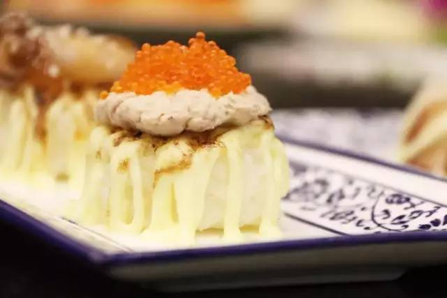 这款吞拿鱼熔岩寿司,看着有点像月饼,哈哈。上桌前要被炙烤几秒,然后再放上吞拿鱼和鱼籽。口感很有层次感。