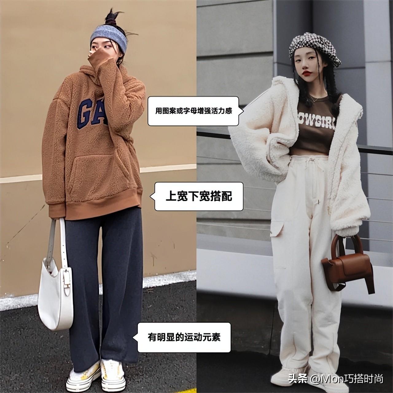 不管是摇粒绒卫衣还是摇粒绒开衫,都能做休闲惬意的运动风。用上宽下宽的方式配运动裤或卫裤,结合帆布鞋、发带等代表性运动元素,冬天也要活力满满!