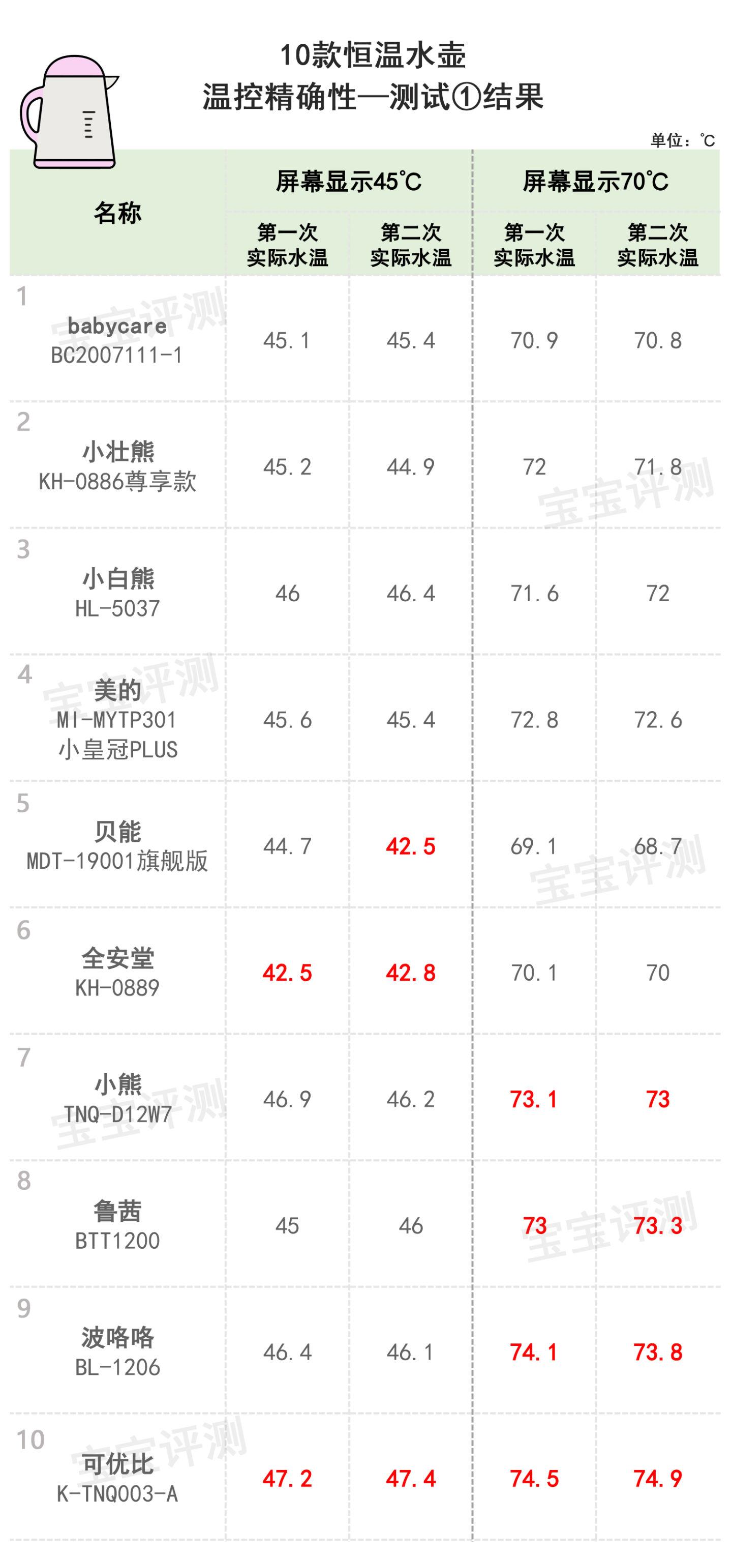 测试①:20℃室温环境下,在恒温水壶内装入1L常温水,选择“45℃加热模式”,当屏幕显示温度达45℃时,立即测量实际水温,每款样品测试两次。