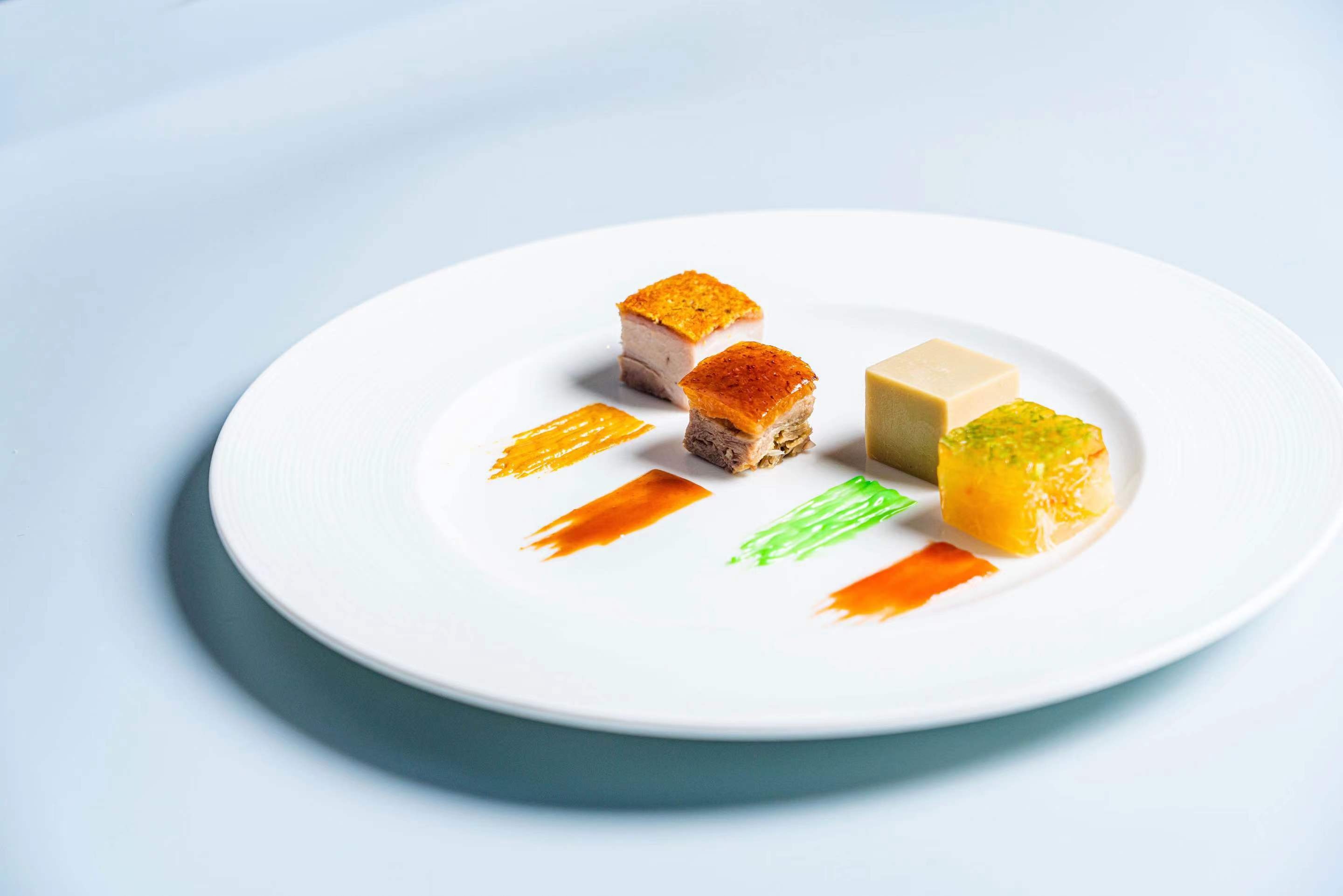 此道菜式讲究的是精美别致,包罗万象。酸辣蟹肉鱼肚水晶方结合秋蟹肉的鲜味,鱼肚的Q弹和香茅柠檬的清新香味,柔滑爽口,丰富您的味蕾。清酒鹅肝脂香醇厚,入口即化。香酥的脆皮烧腩肉,色泽金黄;深井烧鸭皮脆肉嫩,食之肥而不腻。
