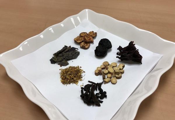 材料:乌梅4钱、山楂1钱、洛神花4钱、桂花2钱、紫苏1钱、陈皮1钱、甘草1钱