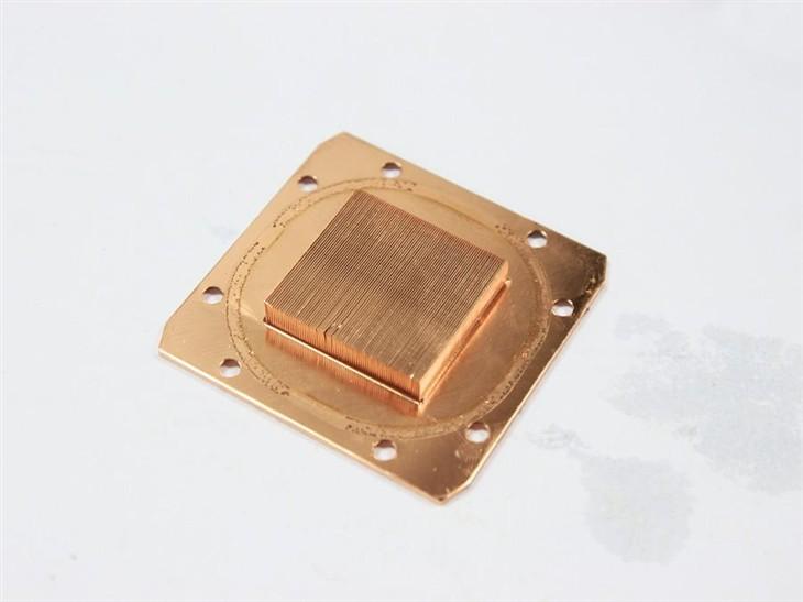 冷头内部采用了微水道设计,冷头上的鳍片要比同类产品要密的很多,配合强劲的水泵以及较粗的水管能发挥出微水道冷头的能。