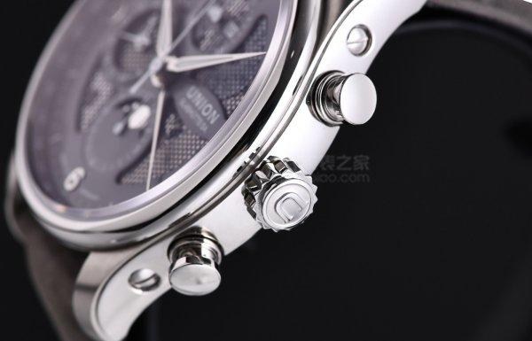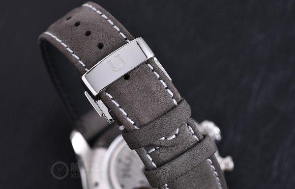 表壳的另一面是表冠以及计时操作按钮,表冠顶部镌刻有宇联表“U”字标识,四周环绕较粗的防滑纹理,增强了旋转时的摩擦力,便于佩戴者单手操作。