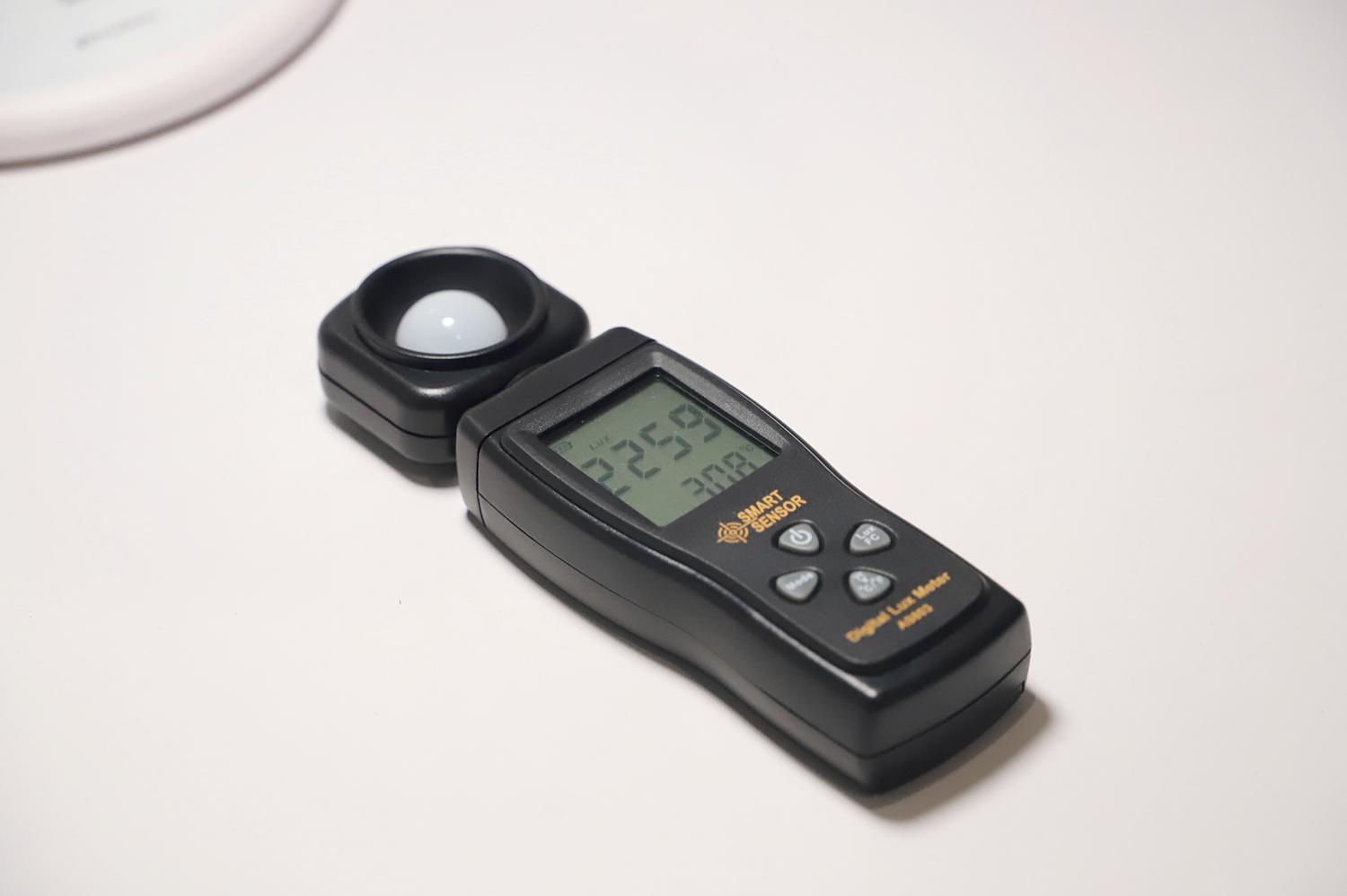普通消费者也可以通过简单的测试来验证它的护眼果,国标AA级照度标准为距离灯光核心区域500mm范围内照度应达到250lx,在距离灯光核心区域300mm范围内应至少达到500lx。我通过照度仪进行了非专业测试,我将台灯放置于140CM长的书桌正中,在灯罩正下方桌面上测试照度为2259lx,而在桌面边缘,也就是距离灯光核心区域700mm测试结果显示为376lx,远超距离灯光核心区域500mm范围内照度应达到250lx的标准。