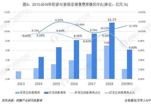 具体,从营销费用来看,两家公司的销售费用均处于较高水平,销售费用占整体营收水平9%-10%区间内。2018年,欧派销售费用达11.77亿元,占整体营收比重达10.23%;索菲亚销售费用达7亿元,占比达9.58%。