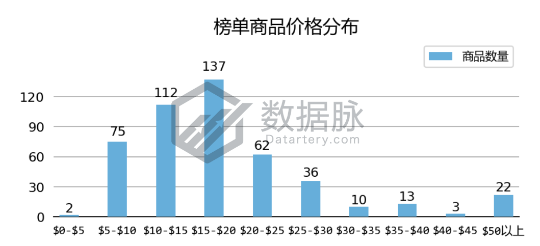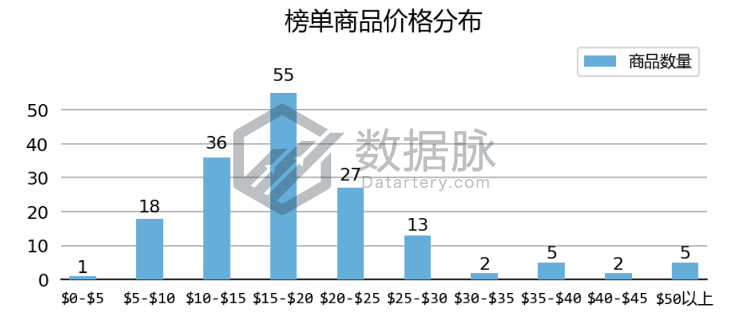 上周 Clothing, Shoes & Jewelry 品类 Best Seller 榜单商品高价$79.95, 低价$4.23,平均价格$20.81。骆探长(shujumai.com)发现,在上榜的商品中, 骆探长(shujumai.com)发现,上榜商品主要集中定价于$10.00-$20.00价格段,其中多达33.54%的上榜商品价格分布 在$15.00-$20.00价格段,同时定价于$10.00-$15.00区间的上榜商品也占据了上榜商品总数的21.95%。此外,上周有5款上榜商 品的定价超过了$50.00,占上榜商品总数的3.05%。相较于上期分析,该周进榜商品的平均价格出现回升,高价商品进榜机会上升。