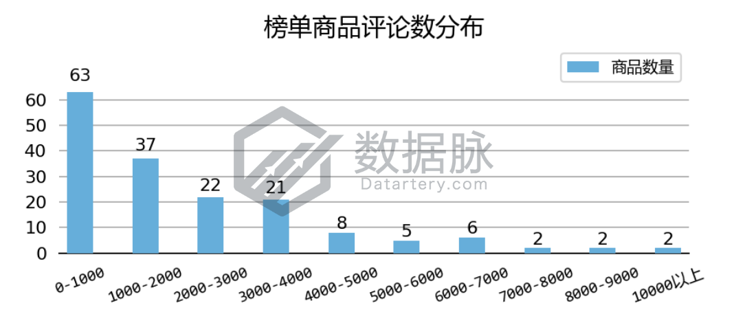 在上周登榜 Clothing, Shoes & Jewelry 品类 Best Seller 榜单的商品中, 单个商品拥有的大评论数为11328.00条,小评论数为2.00条,平均评论数2270.16条,评论平均星级4.28星。 该周评论数在1000条以下的上榜商品较多,占上榜商品总数的37.50%,另有22.02%的上榜商品评论数在1000条至2000条之间。此外骆探长 (shujumai.com)发现,上周还有两款评论数破万的商品进榜,占上榜商品总数的1.19%。