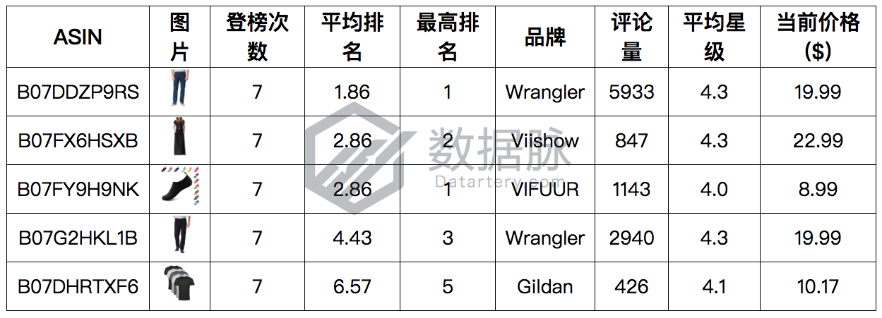可以看到,在上周Clothing, Shoes & Jewelry品类的Hot New Releases榜单中, 榜单综合表现靠前的五款商品中有两款为来自品牌Wrangler的男士牛仔长裤,其中经典的五袋款式牛仔裤在9月1日之后连续两天蝉联Hot New Releases榜首,而同品牌旗下的一款休闲式牛仔裤也在一周中6次跻身榜单前五,取得了平均排名4.43的不错成绩。