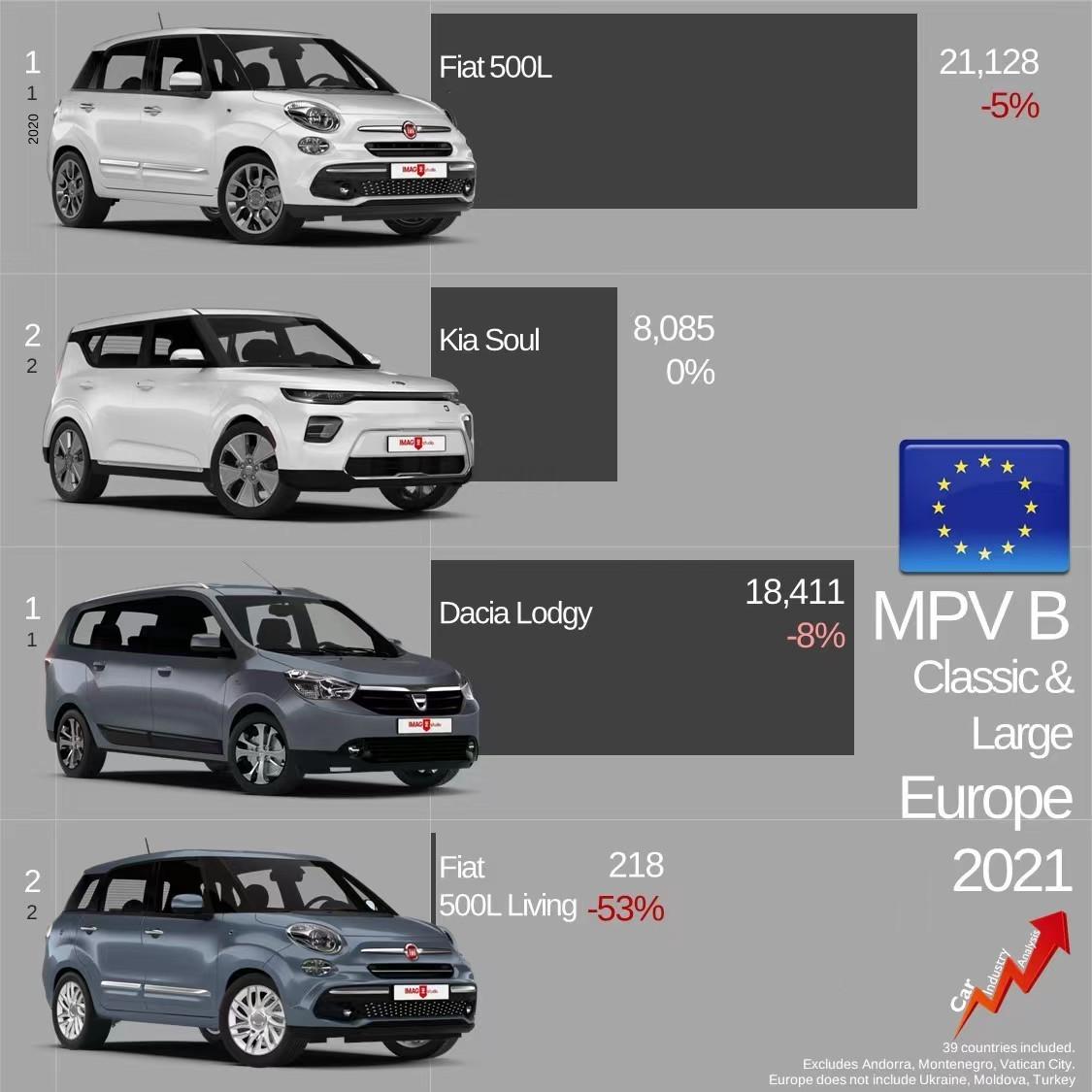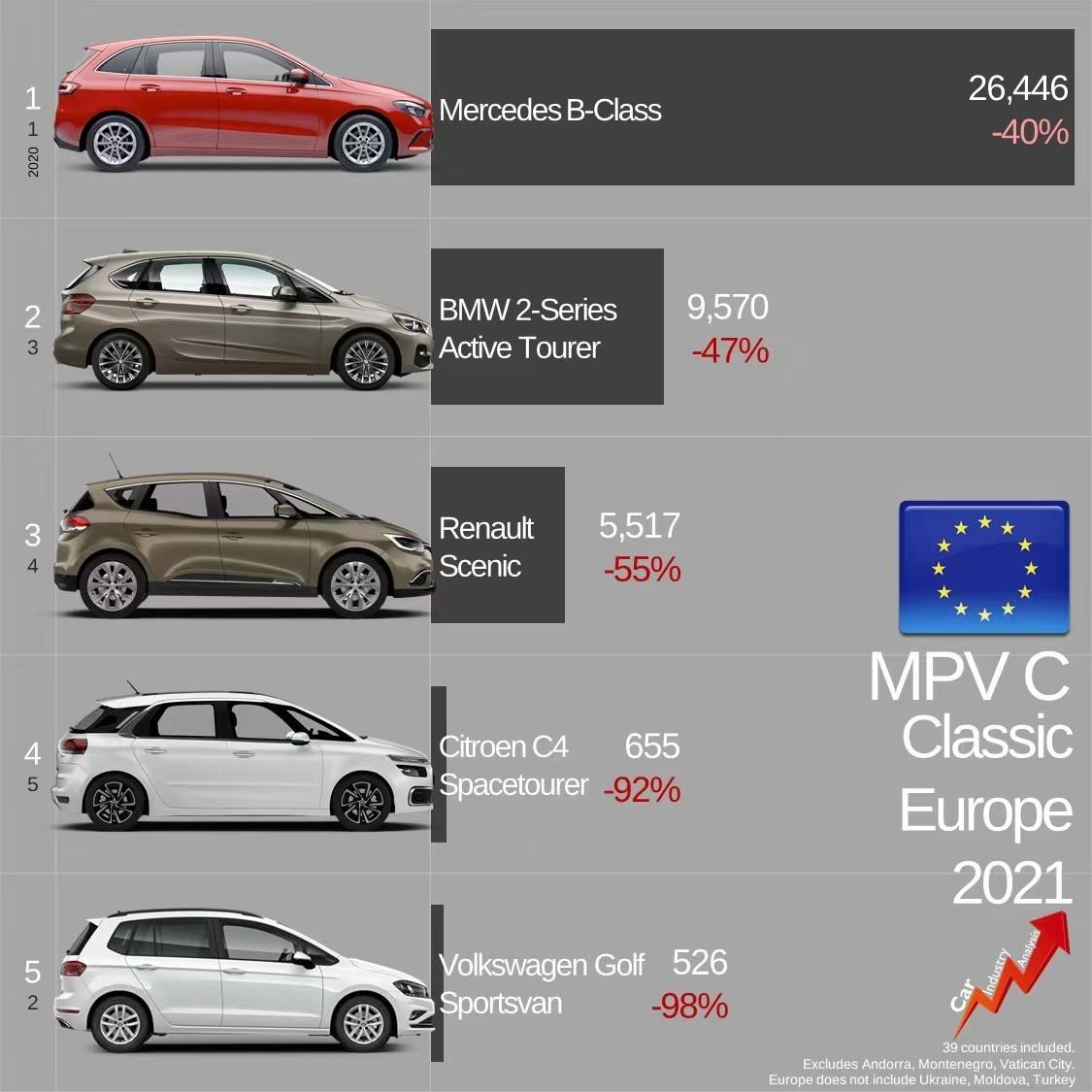 前不久欧洲市场统计出2021年当地市场的MPV销量排行。相较于国内,欧洲对于MPV车型的划分也更为细致一些。那么今天就来盘点B-MPV、C-MPV五座版、C-MPV七座版排名前列各有哪些车型?