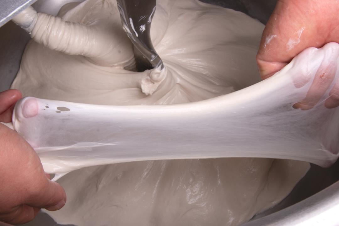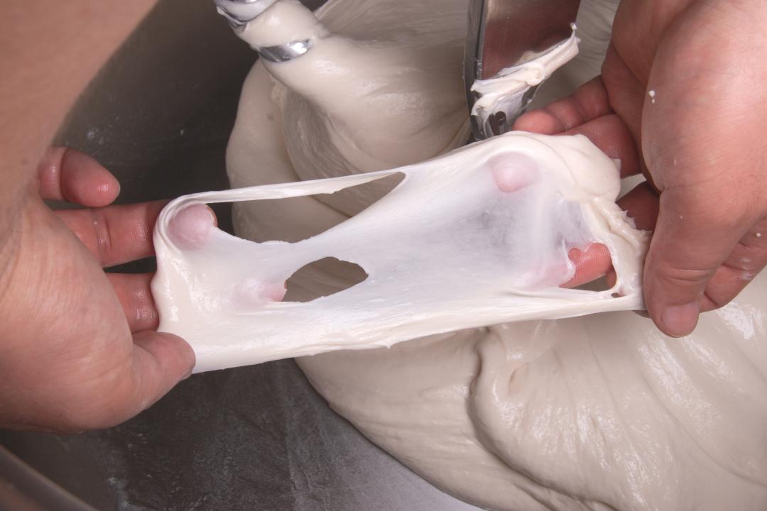 02 / 分次加入蔻多乐有机特级初榨橄榄油搅拌至完全扩展阶段。面团温度26度,基础发酵40~50分钟。
