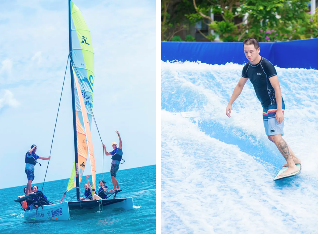 石梅湾是冲浪圣地,酒店沙滩对岸的加井岛,水质极为清澈,潜水再适合不过。酒店本身也是一座海上运动潮玩胜地,拥有各种缤纷多彩的水上活动:滑板冲浪、帆船出海、摩托艇...以及万宁的花园滑板冲浪池,大人孩子都超爱~