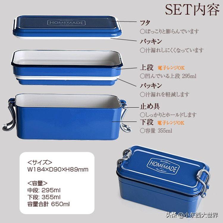 这是一款常规的两层便当盒,有好几种颜色可选,盖子和中间层都有垫圈,密封性很好,也可以放在微波炉里加热。
