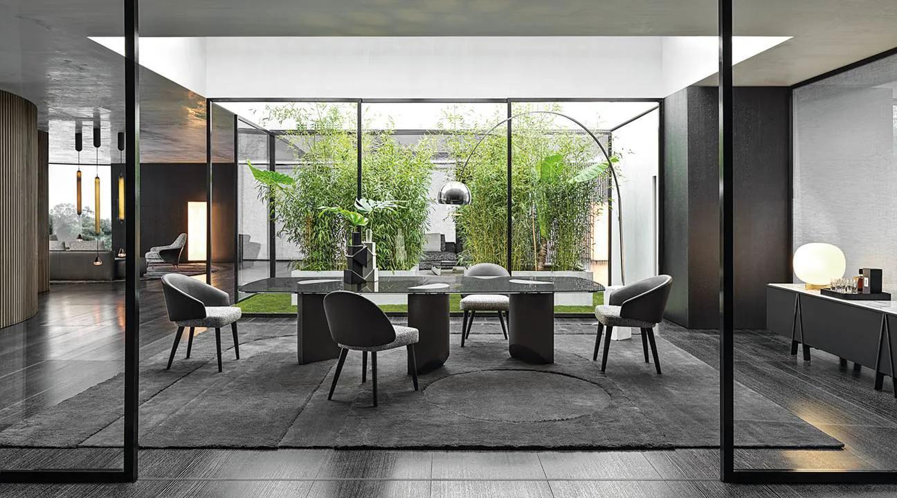 Marvin 桌子采用醒目的雕塑形底座,画出一系列四分之一圆,在金属闪光的照耀下,点缀着黑色嵌件,给人留下深刻印象,并具有出色的多功能性。它是具有建筑灵感的各种餐桌的一部分,其底座采用缎面不锈钢或锡色涂漆金属。