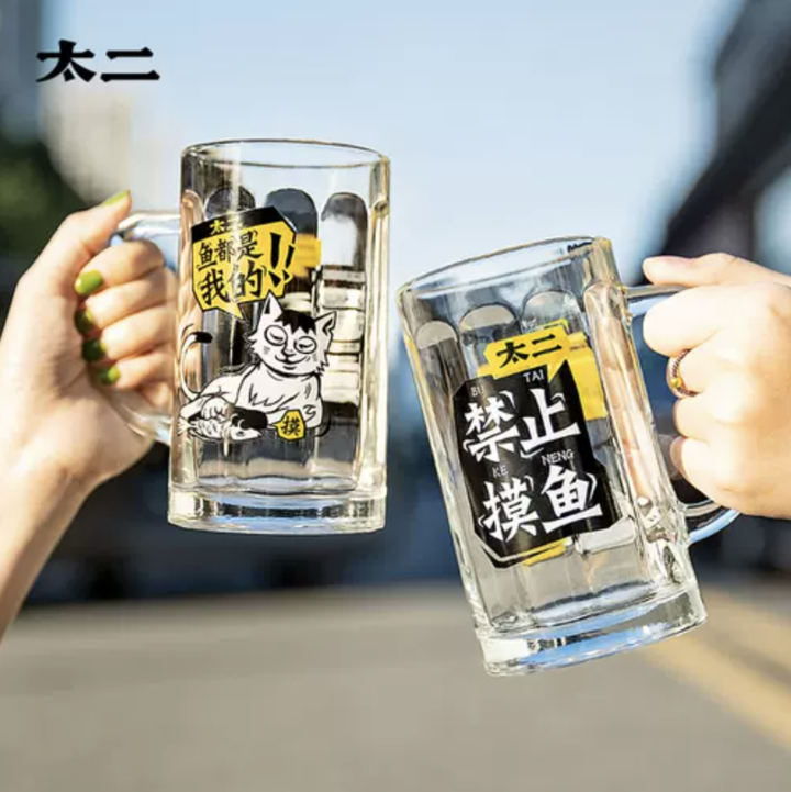 甚至这些杯子也被做成了一种商品或是吸引用户购买的赠品。办公室一位同事用的就是太二的玻璃杯,这是太二推出猫粮公益活动时他入手的杯子,主要是参与公益,杯子则是副赠品。还有一位同事用的是永璞咖啡的文创玻璃杯,买咖啡够一定量就送一个。