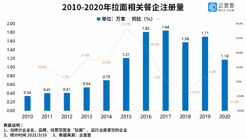 由于市场反应具有滞后性,体现在拉面相关企业注册数量上,就是2017年达到顶点后开始回落。