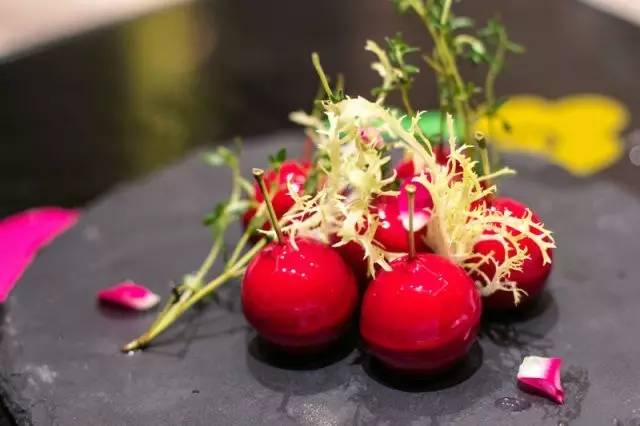 后我们在餐厅经理的推荐下试了主打菜式:红酒鹅肝,做成樱桃的模样。由于点菜时L先生在料理Baby Li,以至于他吃完了真的以为那是樱桃。其实是用山楂红酒特制的啫喱,包括口感丰腴的鹅肝,酸甜的味道解了鹅肝的腻,一口吃的感觉对我来说刚刚好。