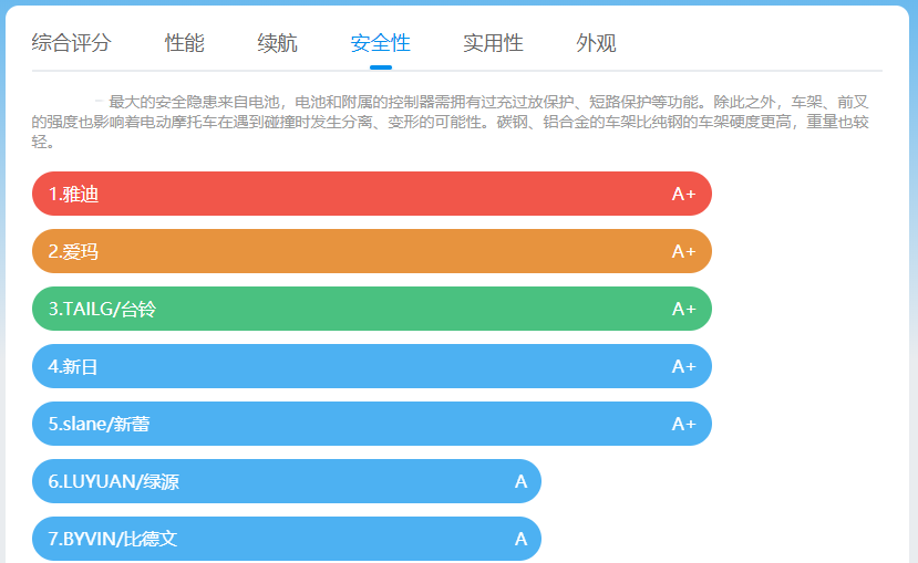 主要是来自电池,尤其是锂电池的应用,经常能看到电动车电池的隐患,除此之外,车辆的车架、前叉等零部件的强度,也会影响电动车碰撞时候的,而在性方面,作为头部品牌的雅迪,表现是好的,排名分别是:雅迪、爱玛、台铃。