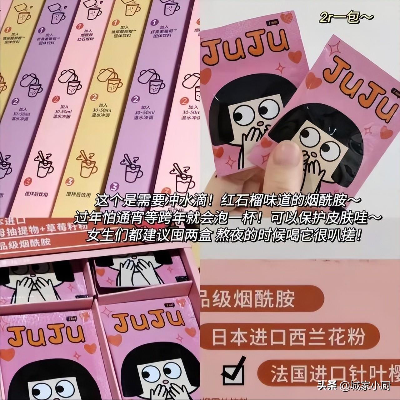 这个是需要冲水喝的,红石榴味道的烟酰胺口服液,过年怕通宵熬夜的姐妹可以泡一杯,可以保护皮肤,女孩子都建议囤几盒,熬夜的时候喝一点很不错。