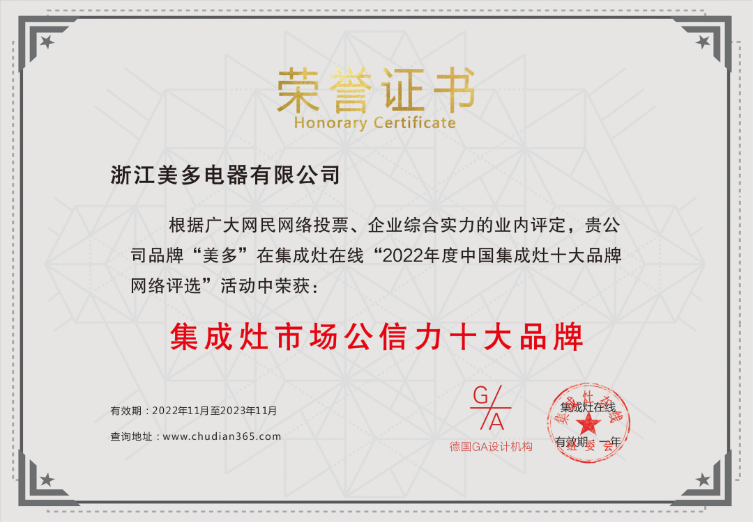 市场公信力是指企业在公众心目中所占位置的高低,包括了内部品质、外部形象等,美多荣获“2022年度集成灶公信力十大品牌”是行业以及消费者对于美多品牌实力和发展成绩的肯定,对于美多产品及服务的全心信任。