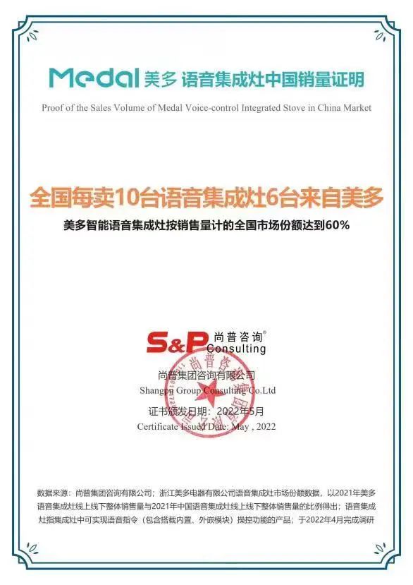 近几年,市场环境的多变,对整个行业都是特殊而充满挑战的,而美多展现出强劲的上升势头,在集成灶领域大刀阔斧地向前迈进,持续抢占市场份额。美多以创新科技重塑厨房空间,开创了“蒸烤一体集成灶”、“语音集成灶”的先河,更是在今年5月获得由尚普咨询认证的“全国每卖10台语音集成灶6台来自美多”的评价报告。美多的成就,正是多年深耕行业,践行品质与服务的真实写照!荣誉卓著,实至名归!