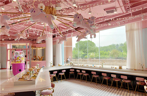 ② 营造梦幻乐园的氛围和拍照打卡情景:粉色少女风的甜品店里让顾客代入“公主”角色,专设旋转木马、摇摇木马、扭蛋机和摆拍区域,并承接包场小活动。