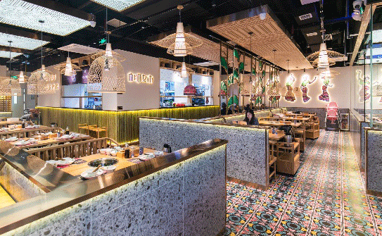 场景视觉营造方面,菜品造型和门店设计着重融入主题故事和角色元素,如【桂满陇】“南宋御街”将临安的酒肆商铺陈设和车水马龙人文景象搬入餐厅;【味蜀吾沸腾三国火锅】结合了工业风、摇滚乐、三国故事墙绘等具冲击性的主题元素。
