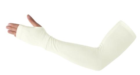 可见,冰丝袖套的主要功能就是上面提及到的两点,一是防晒(防紫外线),二是有光滑凉爽的触感。冰袖戴在胳膊上也不会让人觉得不舒服或束缚,贴在手臂上就都刚刚好,而且还能将手也纳入到保护区,增加了防晒的面积。