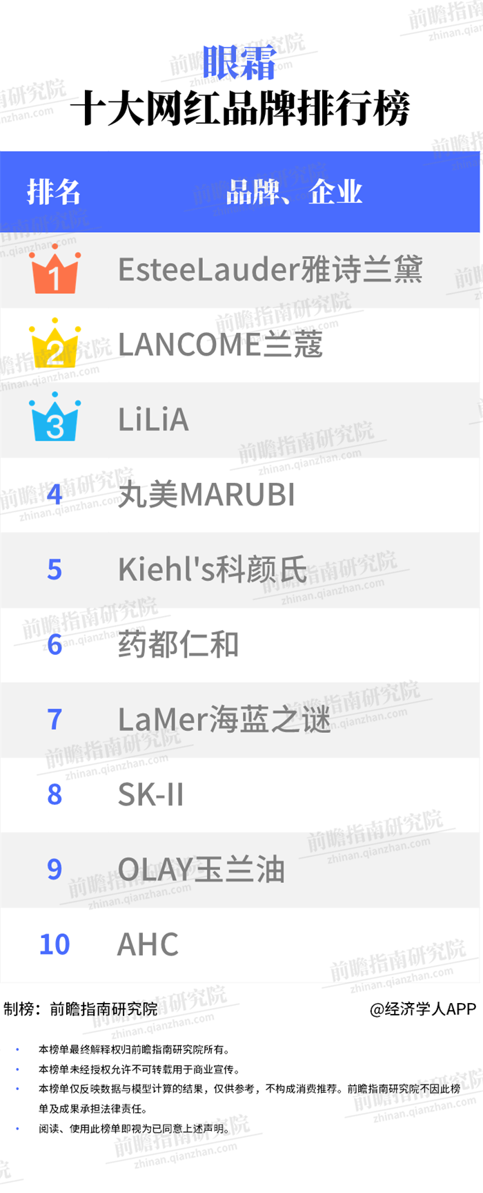 Ⅰ榜单释义:眼霜是针对眼部肌肤的护肤品,一般基础功有保湿补水,其他针对性的功有缓解黑眼圈、去眼袋、除细纹皱纹、抗衰老紧致肌肤等。不同年龄段的消费者可根据自己眼部肌肤的需求选择对应功的产品。另外眼霜的选择也需要考虑到肤质,比如油性肌肤就应避免选择过于滋润质地的眼霜,以免出现脂肪粒。