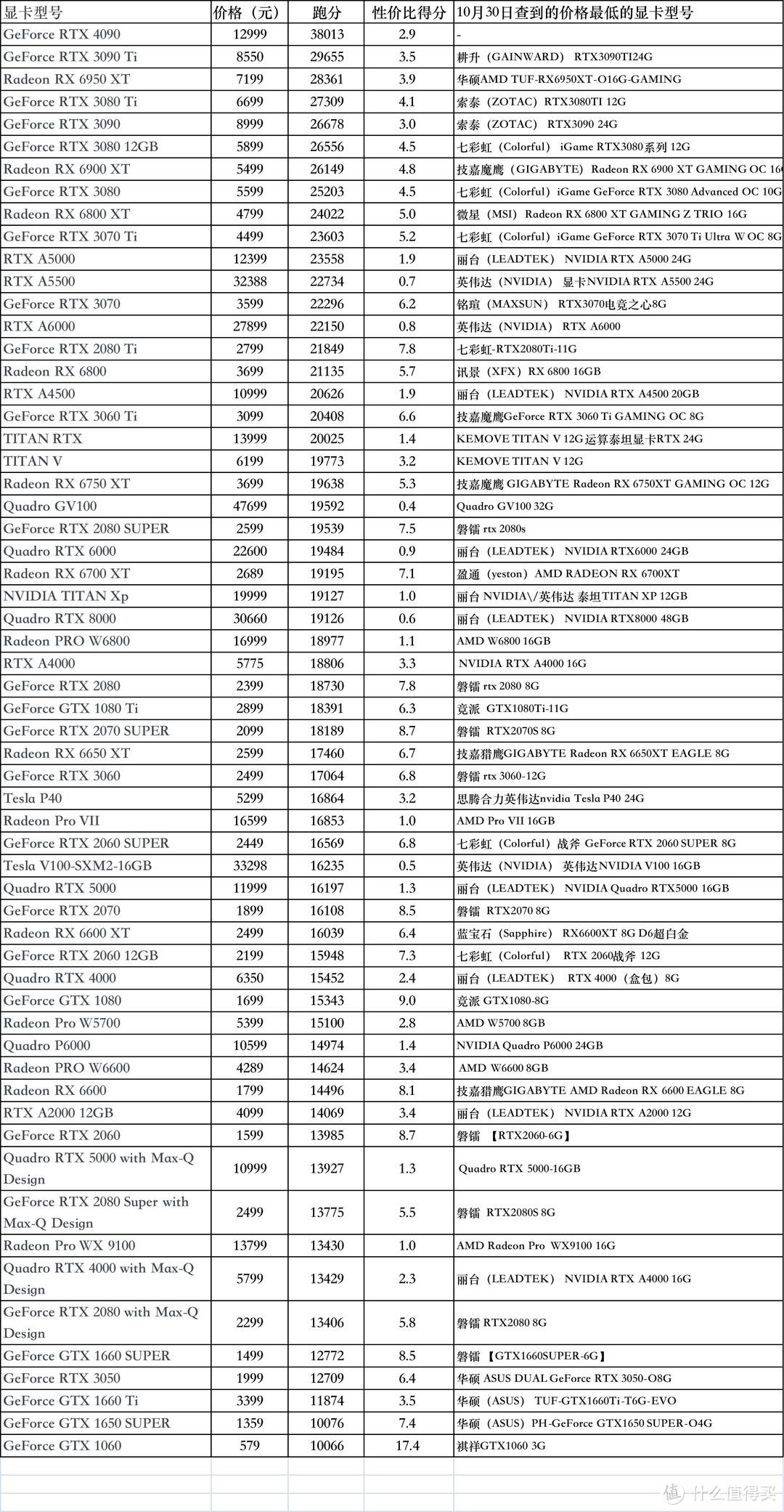 4、性价比得分是用显卡跑分除以显卡价格,获得每元钱可以买到的跑分,用这个性价比得分来进行排序。