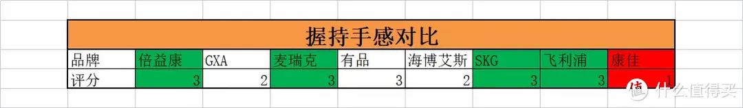 就握持手感上评分如下:倍益康、麦瑞克、SKG、飞利浦领先,康佳垫底。