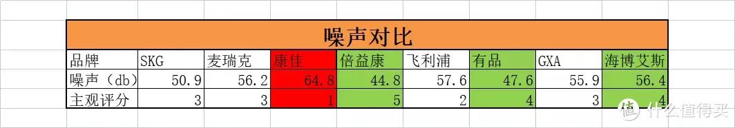 对于噪声不只是简简单单的对比声音的大小,有些筋膜枪虽然识别出来的声音相对较大,但是声音润,不刺耳,典型代表为:海博艾斯;有的虽然声音小,但是却有些刺耳,典型代表为SKG;倍益康声音小,听起来也润有些出乎意料;康佳则属于声音又大又刺耳。