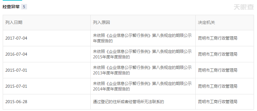 而宝源通经贸则是连续四年未公示年报。2015年6月28日,昆明市工商局因宝源通经贸“通过登记的住所或者经营场所无法联系的”原因,将其列为经营异常。