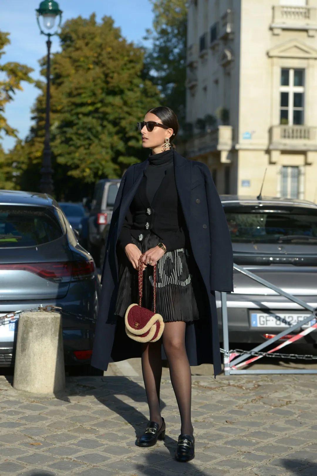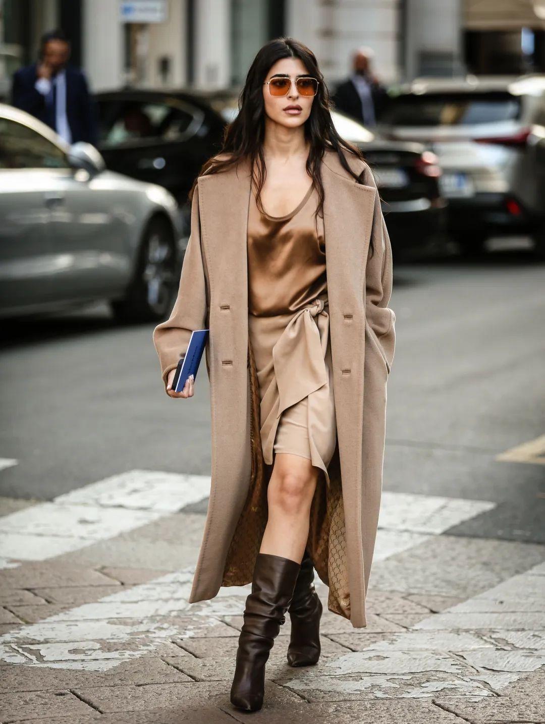 把大气优雅的及踝长裙替换成短裙的话,这样的穿搭在年底会很“有销路”,特别当你需要参加一些重要活动时,脱下外套亦是焦点。
