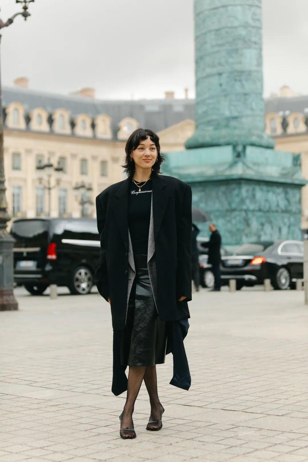 Saint Laurent的2023春夏秀场上,Anthony Vaccarello几乎用强势的宽肩元素贯穿了整场大秀。其中,不少造型是由潇洒的西装大衣搭配修身连衣裙打造的: