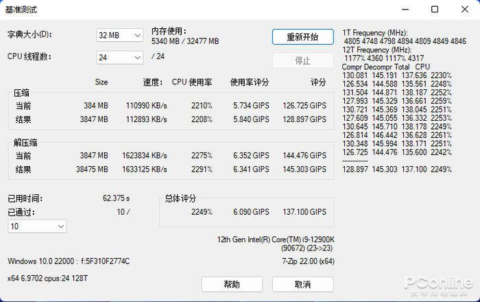 开启XMP后,频率来到6000MHz,此时压缩测试得分128.897GIPS,提升幅度,解压缩测试得分145.303GIPS,整体测试得分137.1GIPS。