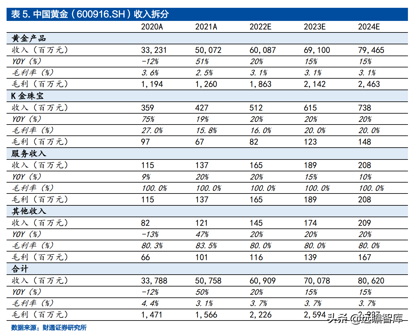 4. 收入预测核心假设:➢ 黄金产品:公司2022年计划新开 500 家门店,拓展店面布局将在 H2 显现。随着 C 端门店布局提速,公司黄金产品有望保持较高增速,预计2022-2024年收入增速分别为20%/15%/15%,毛利率维持在 3.10%。