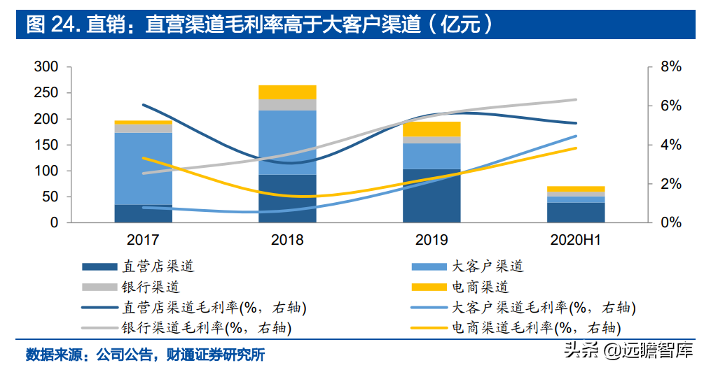 公司直销模式主要包括直营店渠道、大客户渠道、银行渠道和电商渠道。其中直营店主要承担品牌形象的建立和展示以及市场推广作用,因此虽然数量不多,但主要开设在一线城市的高端商圈和购物中心,消费有基础,店面规模大,店远高于加盟门店。