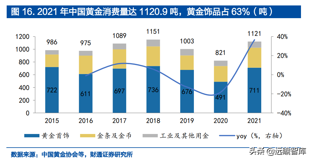 2021年,中国黄金消费量达1120.9吨,同比增长36.53%,其中黄金首饰711.29吨,同比增长44.99%,占黄金消费量总额的63%,同比+3pct,表明出于装饰佩戴的需求长期占据国内黄金消费的主导地位。